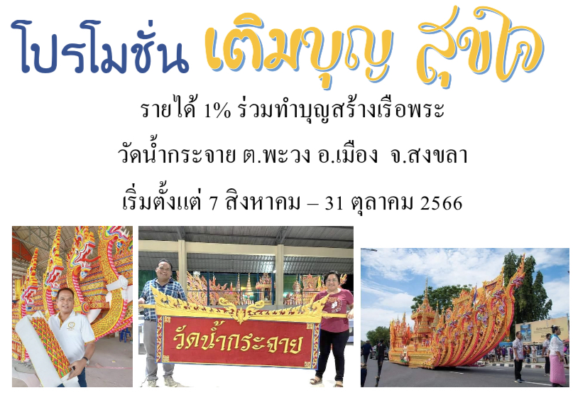 โปรโมชั่น `` เติมบุญ สุขใจ `` รายได้ 1% ร่วมทำบุญสร้างเรือพระ วัดน้ำกระจาย ต.พะวง อ.เมือง จ.สงขลา